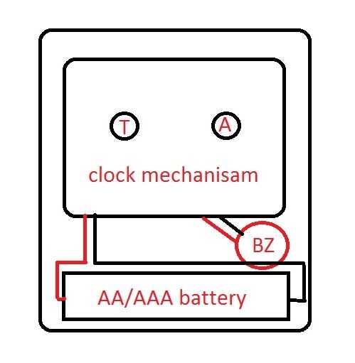 Normalmente cada reloj de alarma, ya sea digital o analógica, tiene una fuente de alimentación, que puede ser desde alguna fuente de batería y luego un mecanismo de reloj (circuitos digitales para lcd/led relojes y analógico para relojes analógicos (aquí utilizo un modelo analógico de barato, pero esto puede funcionar con casi todos los modelos digitales o analógicos) y un zumbador (marcado como BZ) para producir sonido.
