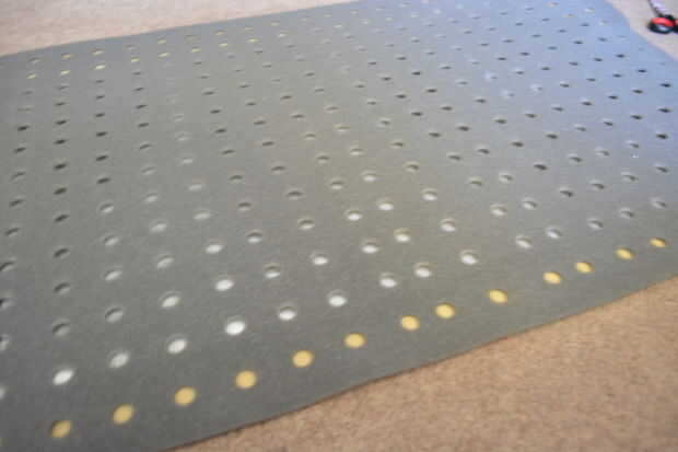 - Cortar las piezas de corcho y espuma de manera que quepa debajo de la alfombra. Para preparar la espuma, perforación 0.5" agujeros de diámetro, cada uno de aproximadamente 1" de separación.