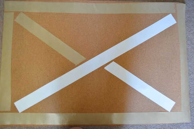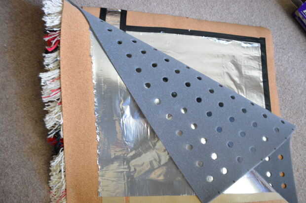 - Ahora tape la alfombra en la parte superior del corcho en el mismo perímetro y la manera de criss-cross que he descrito. Al final vas a tener algo como esto (de arriba a abajo): alfombra, corcho, papel, espuma, papel, corcho.