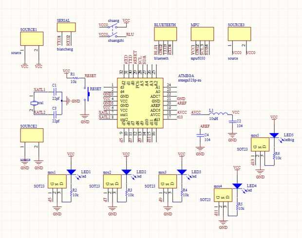 Incluso el más pequeño sistema MCU, luces LED, interfaz de módulo serial Bluetooth, interfaz del módulo sensor de MPU6050.