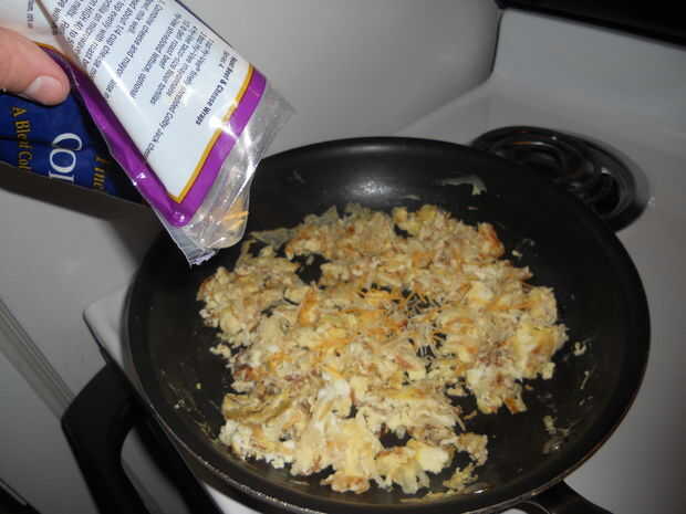 Puede Agregar queso en ahora si quieres o esperar hasta el final y espolvorear en la parte superior. (Muestra de imagen Agregar queso al final de la cocción). Añadir otros ingredientes como, por favor. Si se agregan las verduras, añadir al mismo tiempo como huevos que se cocinan completamente. Si agregar espinaca o salsa, es mejor esperar hasta que el huevo esté cocido en su mayoría.