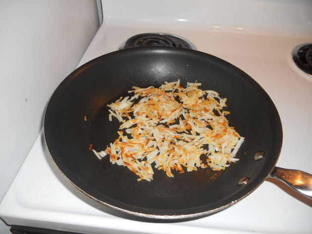 Let cook, hash browns los bancos según sea necesario, hasta que estén doradas.