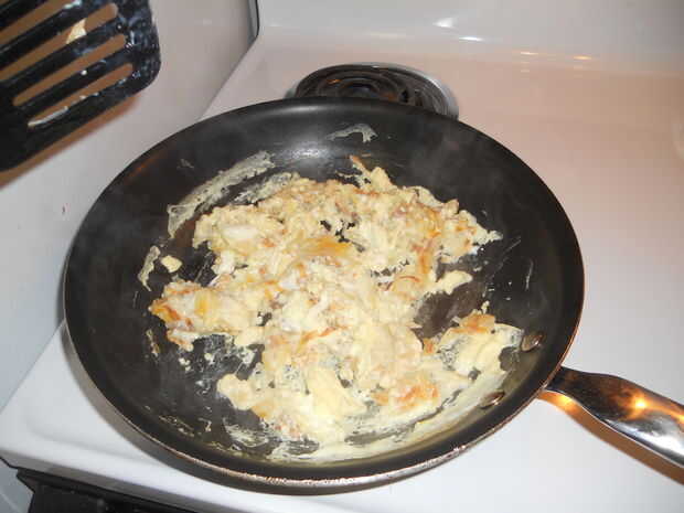Como cocinaran los huevos, asegúrese de mezclar a menudo así se cocinan completamente y usted obtiene más de una mezcla de huevo revuelto que una tortilla.