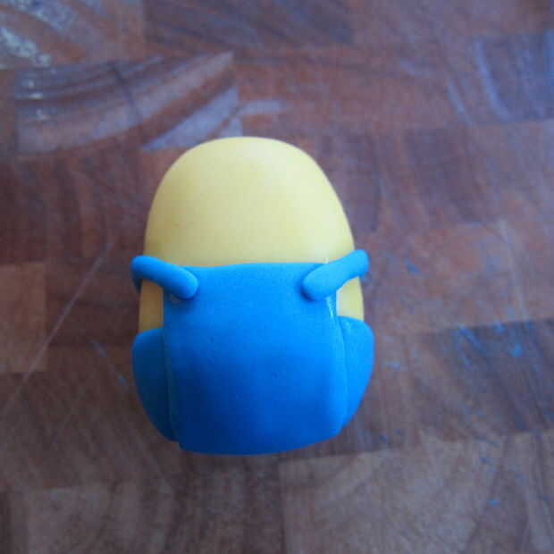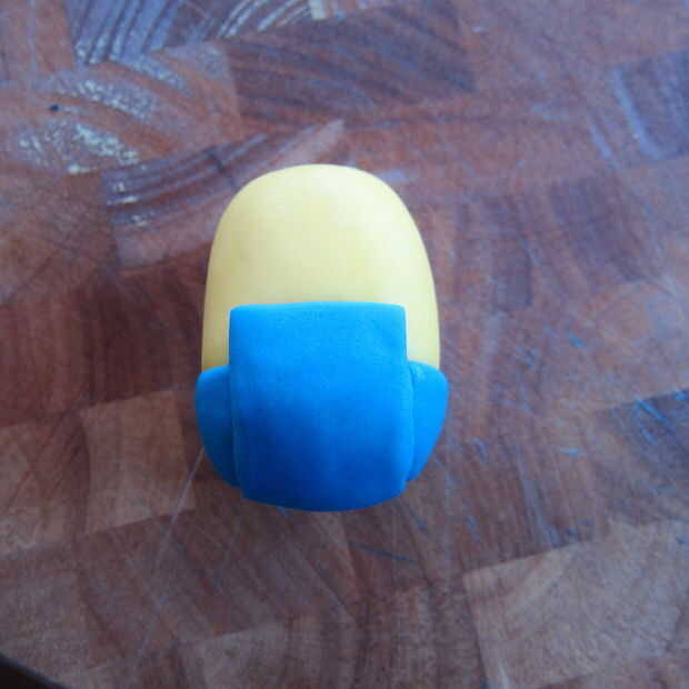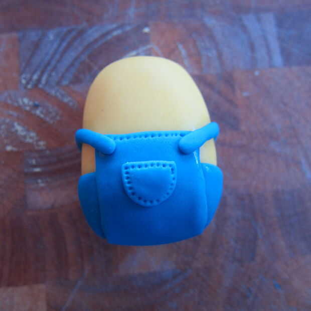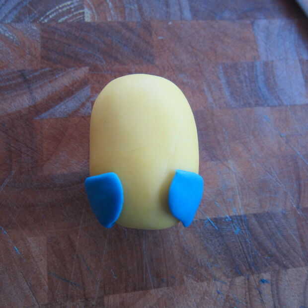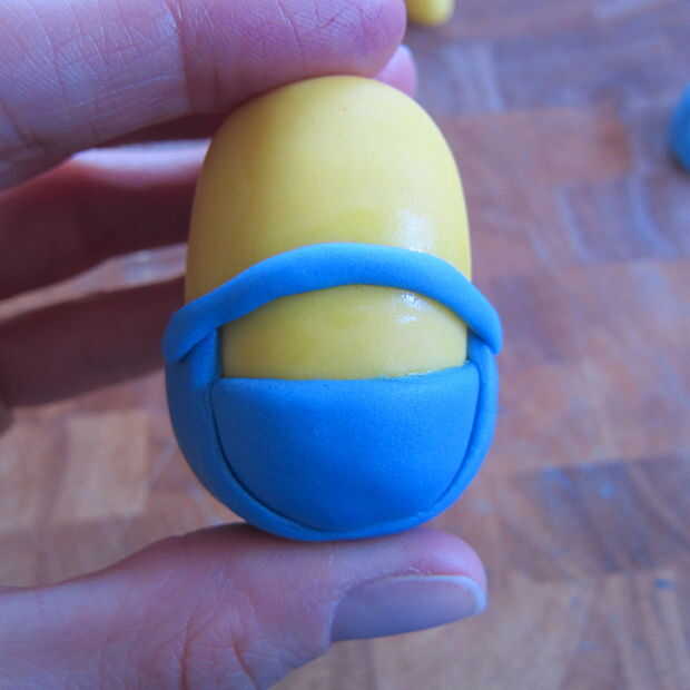 2. usando pasta de azúcar azul hacer dos formas de medio círculo y utilizando un poco de agua sujete a los lados cerca de la parte inferior del cuerpo.