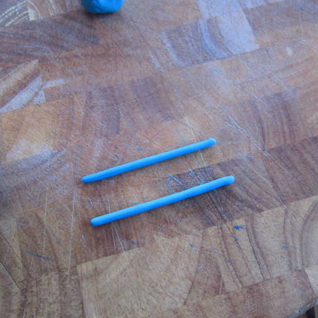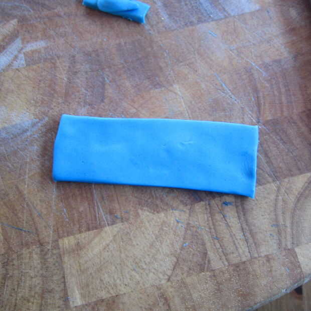 4. Extienda dos formas de serpiente de fondant azul. Presione ligeramente para aplanarlos y sujete de la parte superior de la parte delantera de los pantalones a la parte superior de la parte trasera de los pantalones.