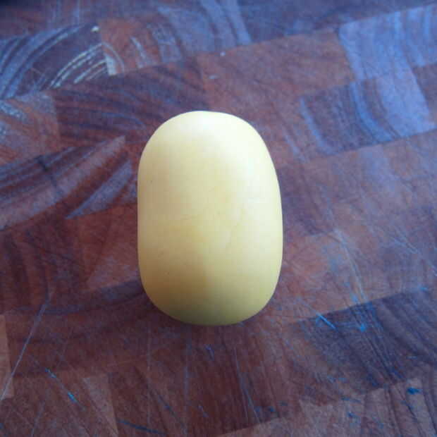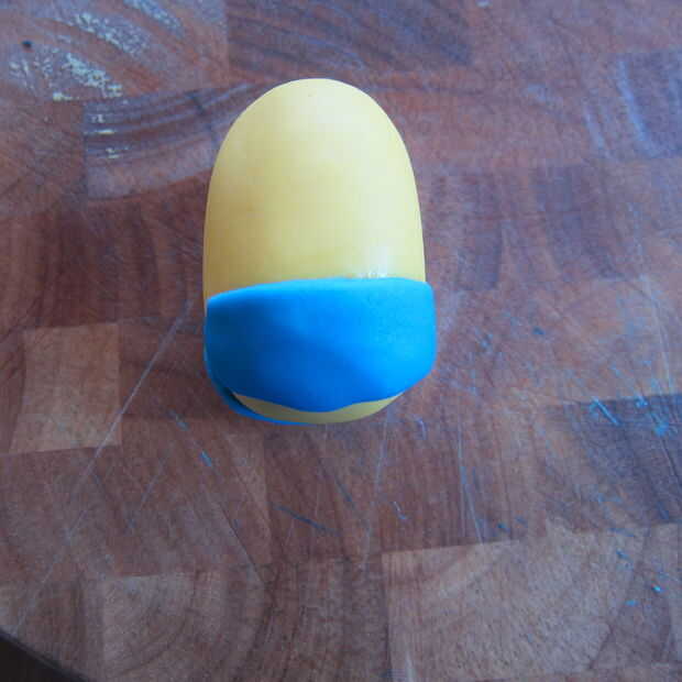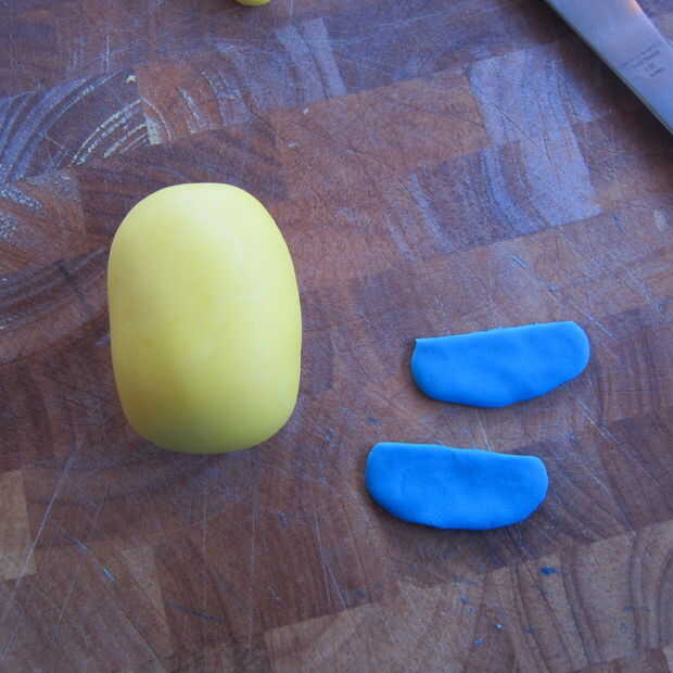 1. para el cuerpo básico, hacen una forma de huevo con fondant amarillo. Aproximadamente 2 1/2 a 3 pulgadas de alto dependiendo del tamaño deseado.