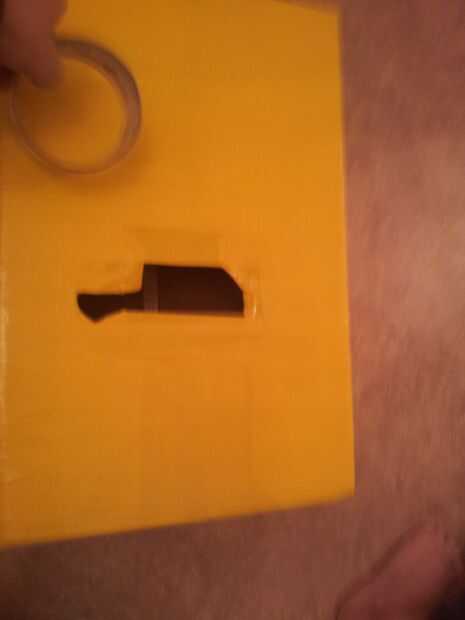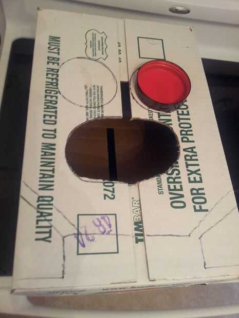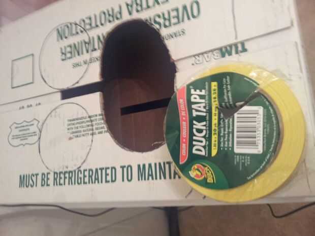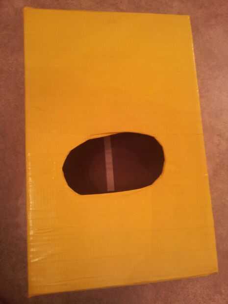 Ahora, recorta la forma que desee la boca para ser. Entonces cubra la caja entera con la cinta amarilla. Envuelva la cinta alrededor del interior de la boca.