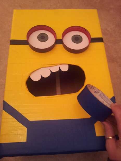 este es un esbirro de Despicable me.Paso 1: fuentes de -cinta aislante-amarillo de papel-con bisagras caja de zapato-pistola de pegamento caliente-tapa (como la clase llegue a los restaurantes en tazas de los niños).-tijeras-cinta de pato-clips-cuchi