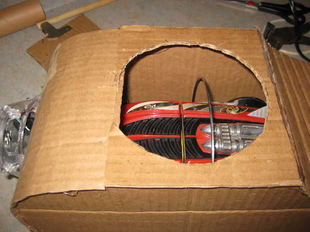 ahora pegar las tapas de las dos piezas de cartón y el tire la pieza redonda de cartón abajo en su lugar como se muestra arriba,