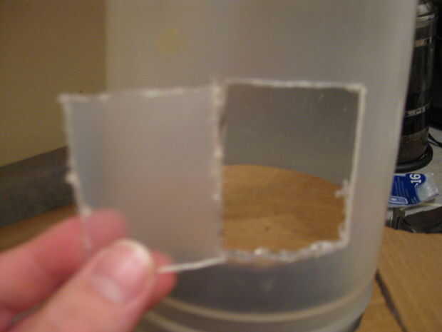 luego de realizar cuatro agujeros, dos en el envase fueron cortar hacia fuera la puerta y dos agujeros en la parte superior de puertas y la parte inferior,