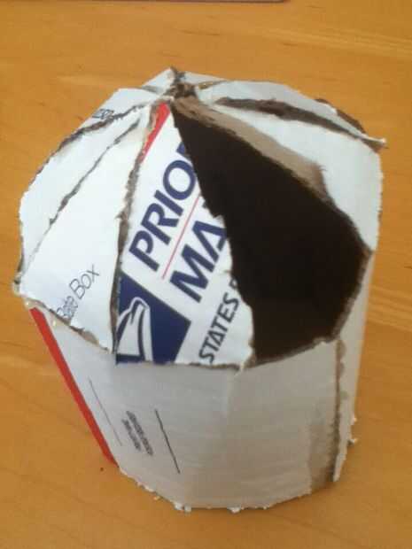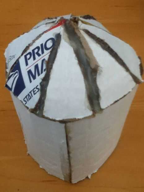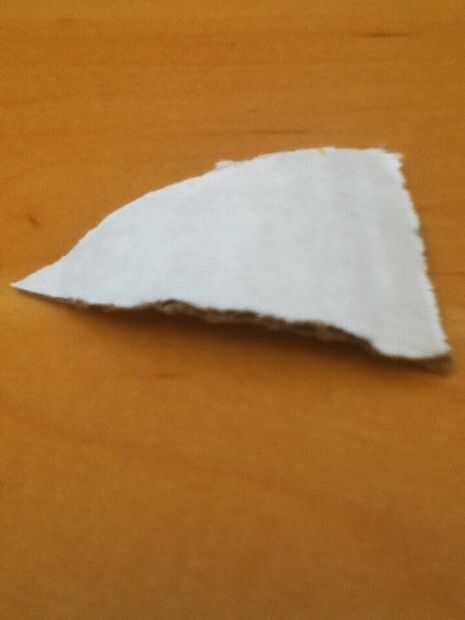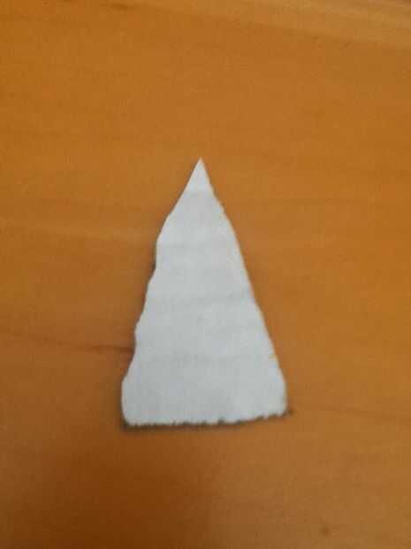 Ahora cortar un triángulo con la base de 1 y 1/4 cm con una longitud de 2 y 1/2 cm. Ahora frótelo contra un borde de una mesa para dar el triángulo una curva... También puede utilizar su mano. Hace unos nueve o diez de estos y caliente pegamento en los extremos del cuerpo como se muestra. Al llegar a la última pieza, puede que tenga algo de espacio extra que se puede utilizar llenándola con caliente pegamento o utilizar trozos pequeños de cartón. Usé el pegamento caliente.