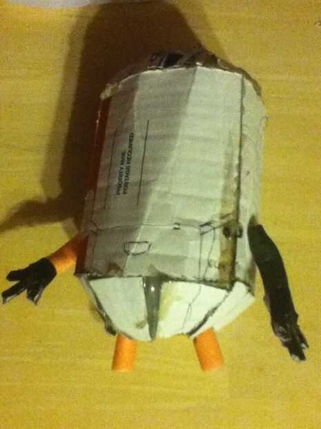 reciclado de cartón, cinta, tapas de mantequilla de maní = Minion!  Estábamos tratando de pensar en un cuadro del día de San Valentín para una fiesta de escuela cuando se nos ocurrió la idea de combinar el concurso de Instructables con la caja de San