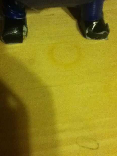 Hacer un rectángulo con 3 y 1/2 centímetros de longitud y 2 centímetros la base ahora doblar todo excepto como 1 cm de la misma como se muestra. Luego corte una curva poco fuera sólo la parte doblada como en la foto. Ahora unir los dos extremos. Hacer dos de estos. Ponen cinta adhesiva negro y pegamento caliente a las piernas con la parte plana hacia el suelo.