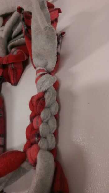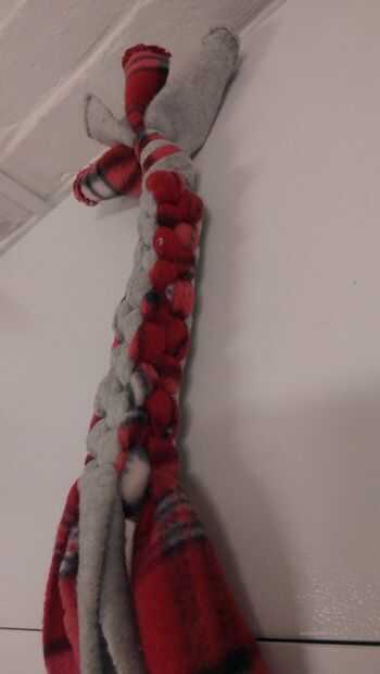 Vi un juguete como este en una casa de amigos y creo que la compraron en alguna parte. Tenía los materiales en casa y decidí probar lo que es yo mismo. Fue fácil de hacer, durable, y disfrutan de mis cachorros los componentes del juguete de tela suav