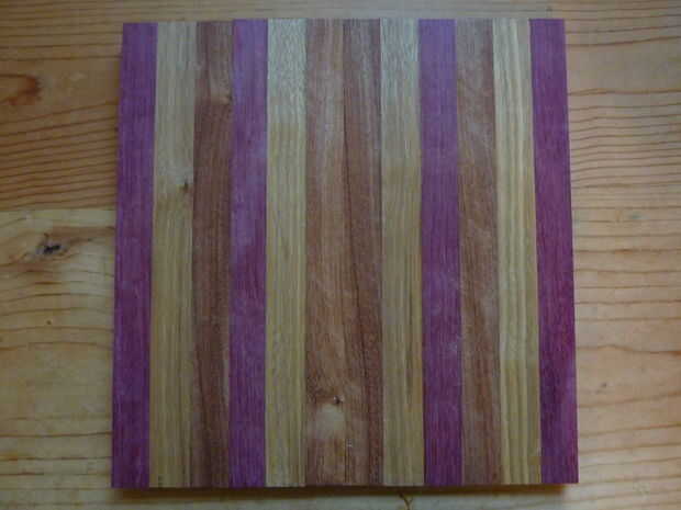 El primer paso es preparar el espacio en blanco de que se corte las piezas del tazón de fuente. Recomiendo hacer el espacio en blanco por lo menos 12 "x 12". Puede ser una pieza de madera sólida o un laminado de diferentes tipos de madera. Si usa más piezas con colores contrastantes, hace el diseño final en el recipiente mucho más impresionante. Utilicé un laminado paralelo de 3 tipos de madera para este proyecto, pero se puede hacer mucho más por cambiar el grosor de las tiras o pegar en diferentes ángulos.