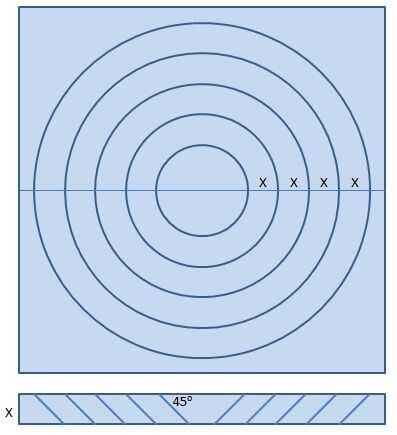 La forma más sencilla de hacer un tazón de fuente es cortar los anillos con un ángulo de 45 grados. Así, los anillos son tan lejos aparte como el laminado es grueso (ver imagen abajo). Recomiendo el diámetro del círculo interno de al menos 3".