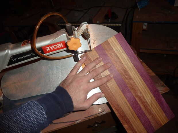 Sin embargo, no tengo un buen taladro, así que no puedo hacer los agujeros de entrada constante. Por lo tanto, se me ocurrió una forma para no tener que perforarlos. Simplemente hacer el laminado hasta mitad y cortar los semicírculos que más adelante se pegan para dar círculos completos. Así no debe preocuparse acerca de la precisión de los orificios de entrada o poner/sacar mi hoja de sierra caladora. Ver la segunda foto para ver exactamente lo que estoy hablando.