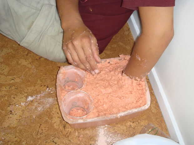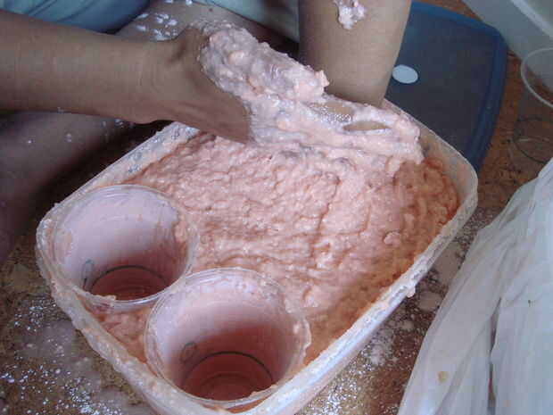 Este recipiente no era lo suficientemente pequeño como para conseguir el alginato mezclado para cubrir mis muñecas como yo quería, así que había atascado dos tazas vacías en un extremo de la misma. ¿No puede una chica conseguir algún desplazamiento por aquí?
