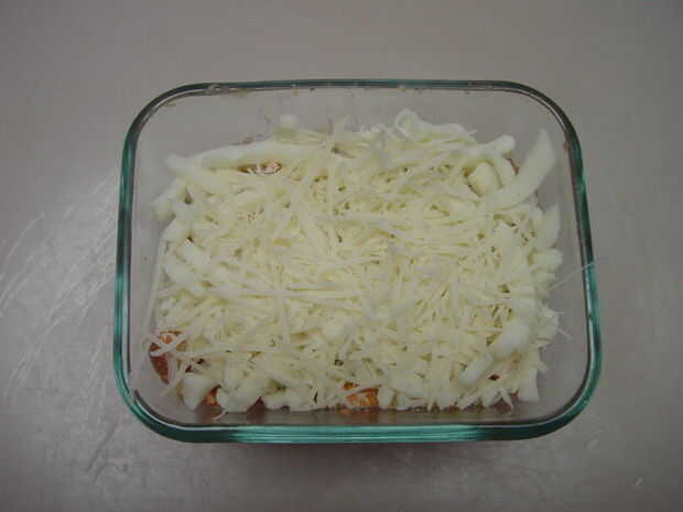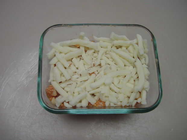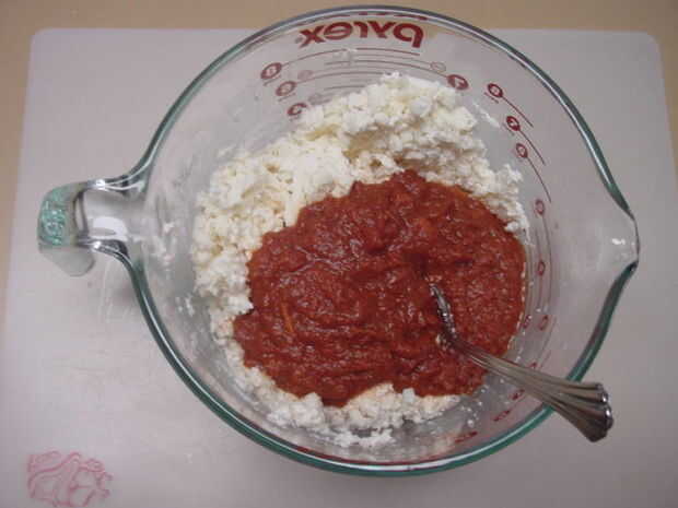 1. mientras se cocina la pasta, en una olla 3,5 qt vidrio, combinar la ricota, Mozzarella y parmesano. Mezclar bien.
