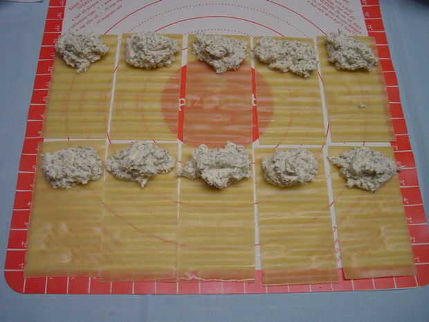 5. partes iguales cuchara de relleno en un extremo de los tallarines.