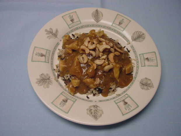 6. placa de la salvaje y la cuchara sobre el arroz, el pollo del Curry, arroz y cubrir con nueces de la India.