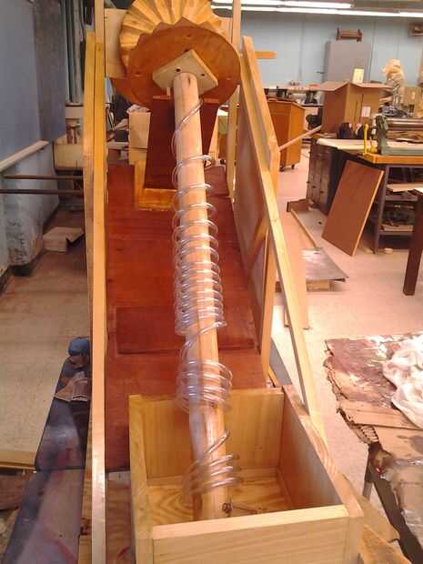 En mi escuela secundaria materiales industriales clase a mi amigo y uso de materiales y herramientas que nos proporcionadas para resolver problemas. Nuestro profesor Sr. Eberts es un gran fan de Da Vinci y sus inventos. Nos dio una lista de las máquinas de Da Vinci y decidimos tratar de recrear el Archimedes Screw con algunas de nuestras propias modificaciones. Porque poco o nada grabados especificaciones fueron dadas a sus inventos, nuestro objetivo era recrear el lo mejor que hemos podido por lo que habíamos visto y lógicamente fieltro sería trabajar.