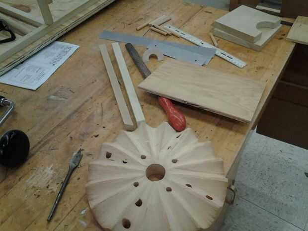 1. talle 2 de las ruedas de madera con raspadores. Cada equipo debe tener 16 dientes triangulares. Si un diente está demasiado curvado y su adyacente es triangular, hay una posibilidad de interferencia. Usted será como Arnold Schwarzenegger después de esto.
