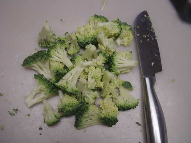 1. mientras se cocina el arroz, cortar el brócoli en trozos de tamaño y en una medida de vidrio de 2 cuartos.