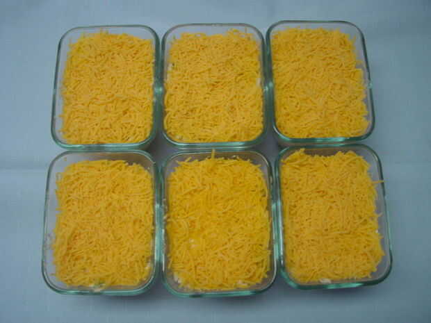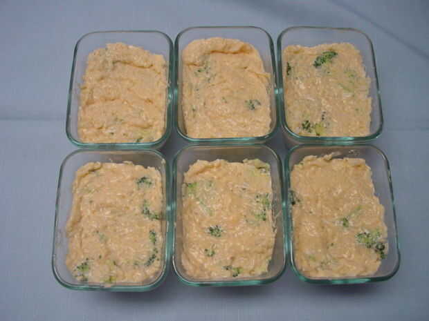 3. porción uniformemente en el Pyrex para hornear platos. Use una espátula de silicona para obtener el brócoli, el arroz y el queso en los platos.