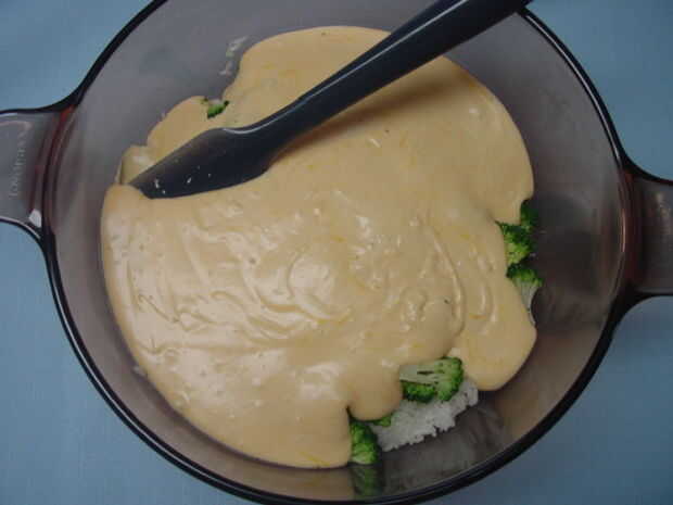 1. Vierta la salsa sobre el brócoli y arroz. Use una espátula de silicona para obtener toda la salsa sobre la pasta.