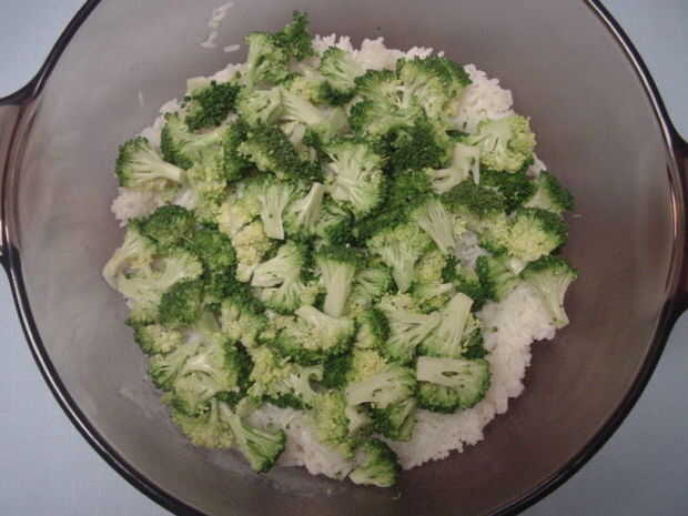 3. cuando se hace el arroz, el brócoli en lo alto de microondas por 3 minutos. Usted quiere ligeramente crujientes, cocinará más en el horno. Escurrir y verter el brócoli sobre el arroz.