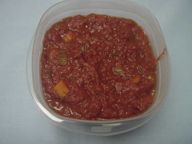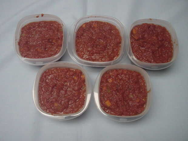 7. enfriar y dividir en recipientes y congele. Usar contenedores de 9,5 onzas con tapa y generalmente obtener acerca de seis contenedores.