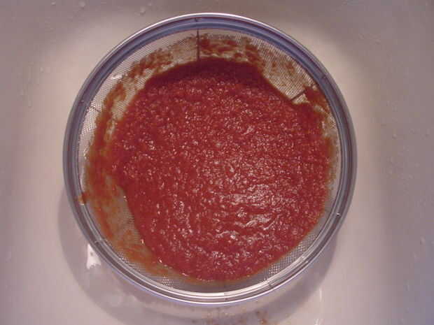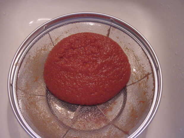 2. uno por uno, vierta la lata entera de tomate triturado en un colador de malla fina de acero inoxidable para drenar. Mantenga el colador a unos 45 grados y gírelo hasta que el agua deje de drenar. El tomate triturado se "endurezca" cuando la mayoría del agua se ha ido. Si "tirar" el tomate triturado en el colador, perderá algunos de los sólidos y obtener una producción más pequeña pero que todavía funciona. Asimismo, la cantidad de agua en tomate triturado varía, especialmente entre las marcas. Añadir el tomate triturado escurrido a la olla. Escurrir el petite tomate y añadir a la olla. Añadir el puré de tomate y caldo a la olla del pollo.