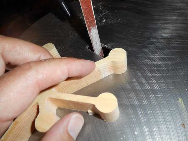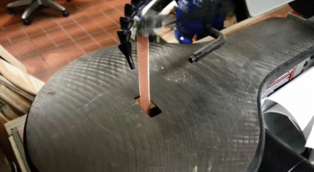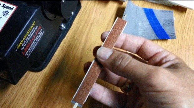 El papel de lija es pegada a ambos lados de la hoja. La hoja entonces se pone sólo en la sierra.
