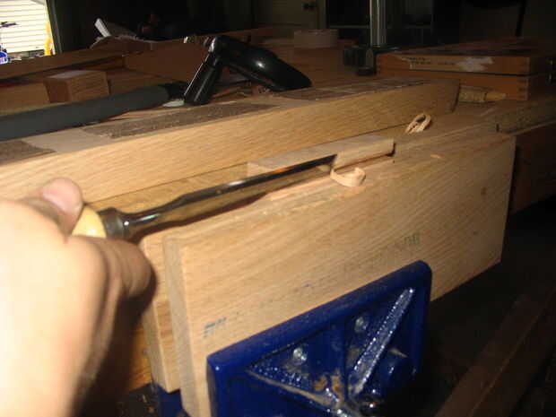 Después de cortar a la guía por un lado, hacer lo mismo con el otro. Después de los que se cortan, puede utilizar el backsaw para cortar el ángulo de la silueta de cola de Milano o simplemente usar el cincel, vas a lo largo de la veta y exija poco esfuerzo. Asegúrese de socavar. Ahora debe tener una cola áspera del pin en la parte inferior de la guía. Use un cincel para limpiar para arriba. El pasador con papel de grano 60 para realmente limpiar la arena.