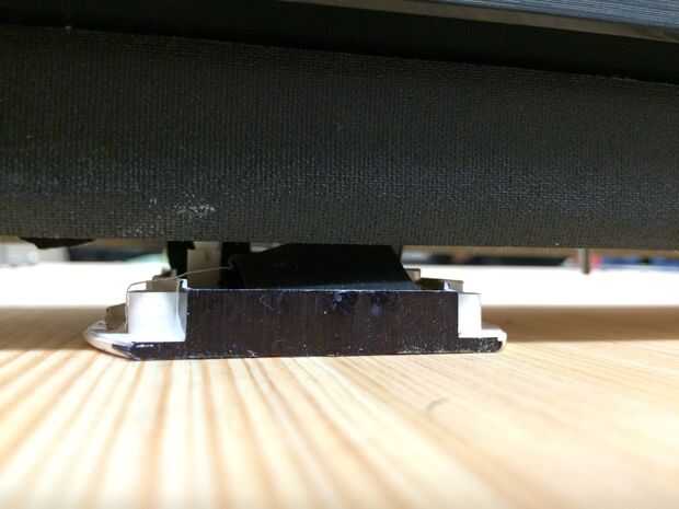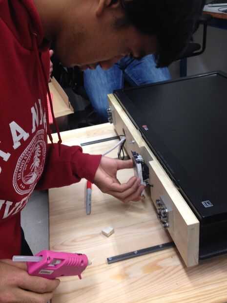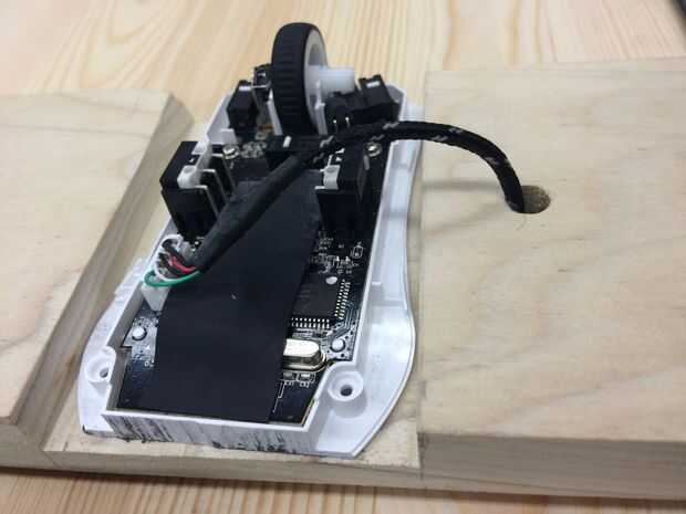 Cuando nos propusimos para implementar el ratón como el dispositivo de seguimiento de posición para el sistema de monitoreo, que originalmente pretende utilizar la rueda de desplazamiento para seguir movimiento. Como se ve en la primera foto, montamos el ratón en la parte inferior de la plataforma de monitor con el hacia el exterior frente a la rueda, de esa manera una vez que la plataforma está montada en el sistema ferroviario, la rueda estaba haciendo contacto sólido con la superficie de la mesa. Sin embargo, durante un funcionamiento de prueba nos dimos cuenta de que la rueda de desplazamiento del ratón no se realizó bien cuando los monitores fueron trasladados a una velocidad relativamente rápida a través de los rieles (las imágenes saltan y posición no se registro con precisión). Por lo tanto, hemos decidido voltear el ratón y utilizar el láser óptico como el codificador de posición, que era mucho más precisos y podía manejar a mayores velocidades.