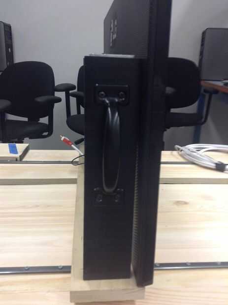 Los mangos fueron fijados en el interior cubierta hemos construido. Las asas que utilizamos eran 5.5" de largo y 1.5" de ancho. Los mangos fueron Unidos de 4.5" de la parte superior de la cubierta de madera, 4.25" desde la parte inferior y ½" de los costados de los monitores (centrados).