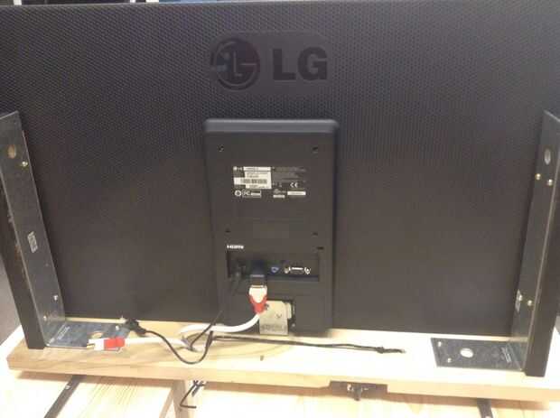 Atamos dos grandes soportes en L para que, cuando la madera se une a ellos, eran unos ½" sangría de los monitores. Luego atamos la madera a los soportes.