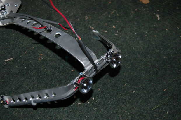 He construido mi marco para mi casco de moto y había doblado por consiguiente el aluminio. Notará que mis faros no giratorio o pivote. Después de años de desplazamientos, todo con luces, descubrí que una vez tuve la luz ajustada, nunca tocó otra vez a menos que consiguió desalineado por chocar en algo. Bump-no-más, esta luz se mantiene fiel a su objetivo.