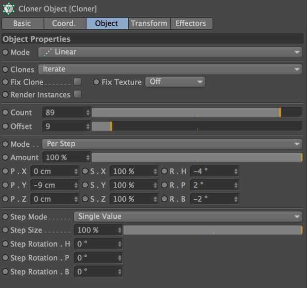 -Haz clic en el Cloner y que sus Propiedades de objeto, es aquí se definan los parámetros que crea la sensación de la espiral.