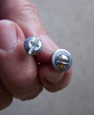 La cabeza del tornillo a la izquierda es el tornillo de la perilla o tirar. El tornillo a la derecha es un tornillo estándar de la ferretería. Notar que su cabeza es más pequeña que el tornillo original. Agregar una arandela le da mejor soporte contra la madera en la parte posterior del frente puerta o cajón y es una buena idea, pero también añade un poco grueso que debe ser considerado en la preparación de un tornillo de perilla o tirón.