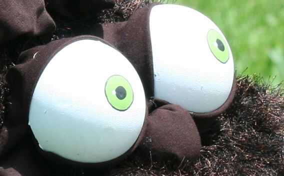 Las tapas del ojo están Marrón tela hecha en un tubo. El tubo fue dado vuelta medio camino dentro de sí mismo para un bonito borde doblado y el ti era pegado al globo ocular. Experimente con la colocación de los ojos en lugar de clavos. Creo que esta es una de las partes más difíciles para hacer. Si los ojos no son derecho todo el traje se ve apagado.