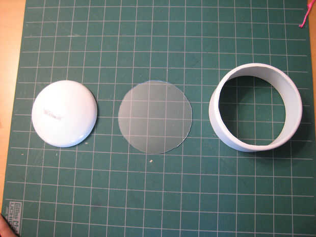 Usando la tapa de PVC de 4", dremeled la parte de la tapa dejando un poco del labio para el plexiglás en. Cortar dos aberturas en la tapa de la correa de nylon para caber aunque. Entonces él jadeó un color metal y coser las tiras para el lado. Debería probablemente incluir algo allí así que nos podríamos apretar en el tiempo. Cortar un círculo de plexiglás con el dremel nuevo (y los anteojos como plantilla). Cabe muy bien... sin embargo no parecía lo suficientemente cerca en el plexiglás para notar que era helado :(