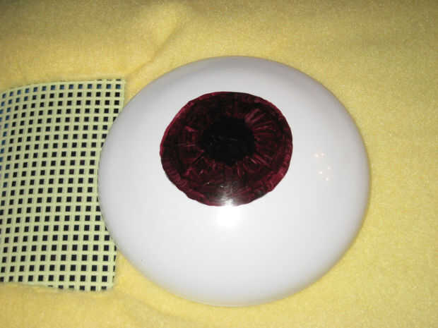 A partir de la tapa de PVC plástico redondeada, utiliza una sierra de marquetería para cortar sólo el extremo redondeado. Utiliza removedor de esmalte de uñas para conseguir paseo del código de barras que estaba allí. Utilizando un marcador permanente gordo negro como base hice un círculo grande para el ojo entero. Entonces volví encima con un rotulador marrón para darle cierta profundidad agradable. Finalmente utilizando un rotulador negro para la pupila. Esto consiguió pegado a la tela con pegamento del gorila.