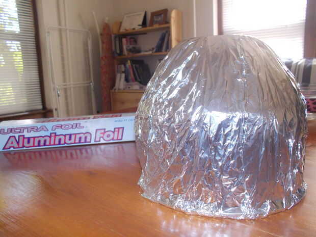 Para hacer la corona del sombrero, usa un tazón de fuente y un molde de cake pequeño y había cubierto con papel de aluminio resistente. Si usted don´t tiene un molde/recipiente que se adapte a sus necesidades, usted puede hacer todo con periódicos de cubiertas de lámina de aluminio.