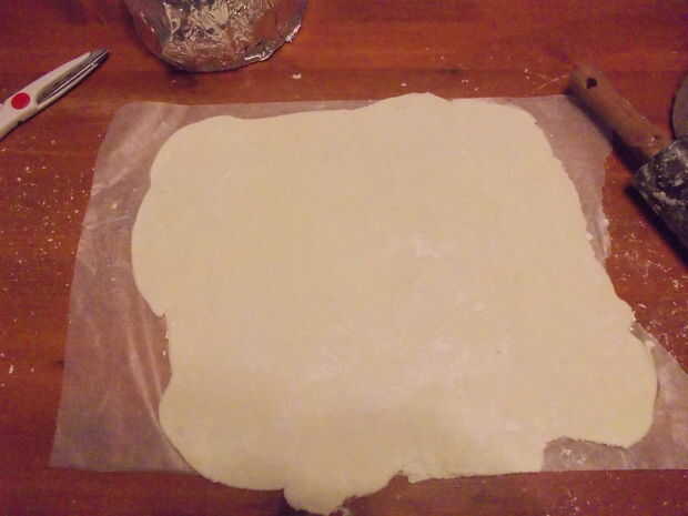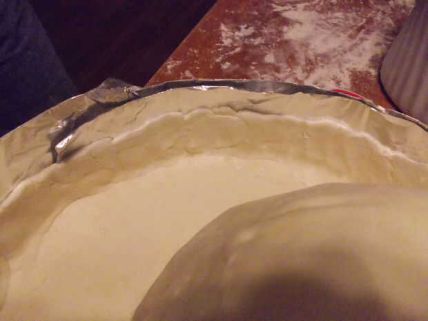 Finalmente, para hacer el borde, rodear el borde con una "pared" de papel de aluminio (que hice con tres capas de papel de aluminio de alta resistencia) y cubrir la parte interior con una fina capa de masa. Una vez más, asegúrese de que unirse el borde con el borde.