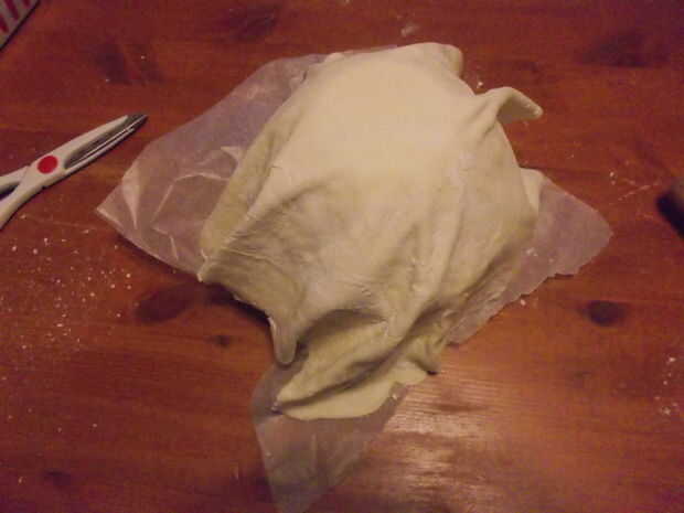 Una vez tienes el molde de corona, cortar un trozo de papel encerado y cubrir con una fina capa de masa. Luego, cubrir el molde con ella, incluido papel. Esto hará más fácil llevar después de hornearla. Cuando usted fija las arrugas, asegúrese de que usted don´t dejar papel entre capas de masa.