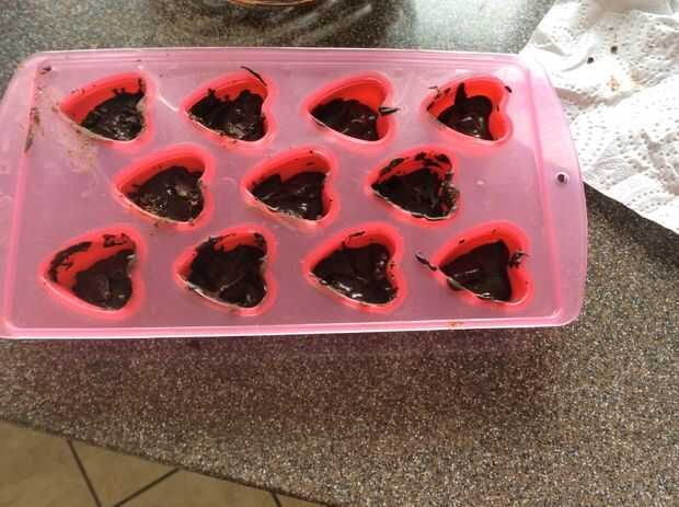 Añadir el chocolate de menta cada molde llenando sólo hasta la mitad. Permitir que se enfríe completamente. Ponga la menta sobra chocolate a un lado.