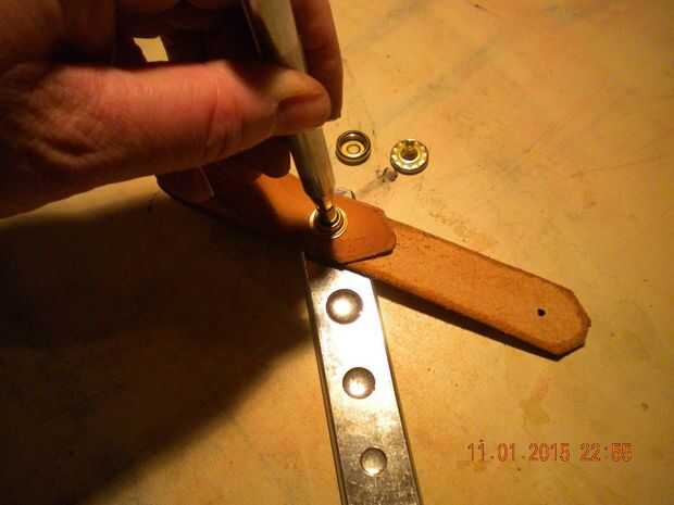 Apriete juntos los dos agujeros adyacentes que están más lejos aparte con el lado acabado del cuero hacia fuera. Deslice el pasador de la línea 24 encaje en el agujero que comienza 6.5" de la final y el pliegue sobre el agujero que comienza 1" desde el extremo de la correa, así que el post va a través de ambos orificios y poner el perno encima del poste. Ajuste el perno.