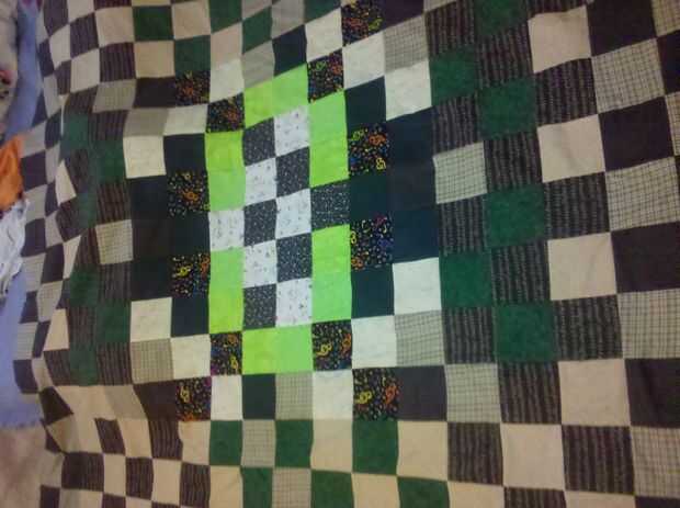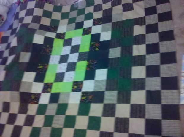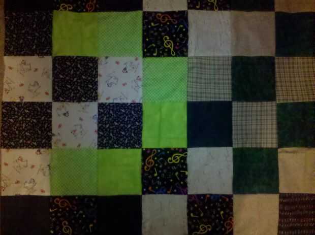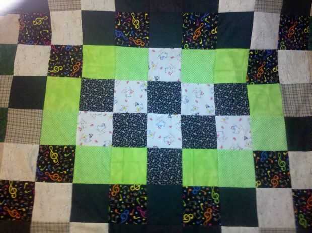 este Quilt es un proyecto especial que tomé para un niño especial. Su color favorito es el verde y le encanta la música. Es un edredón de tamaño queen, acabado en 15 x 18 6" cuadrados (de 270 plazas!) La mejor parte, en mi opinión, es la tela de pollo francés en el centro de la colcha, ya que es un poquito entrar broma entre los dos. Empecé con una doble pirámide en el centro y había construido el resto del patrón hacia fuera.